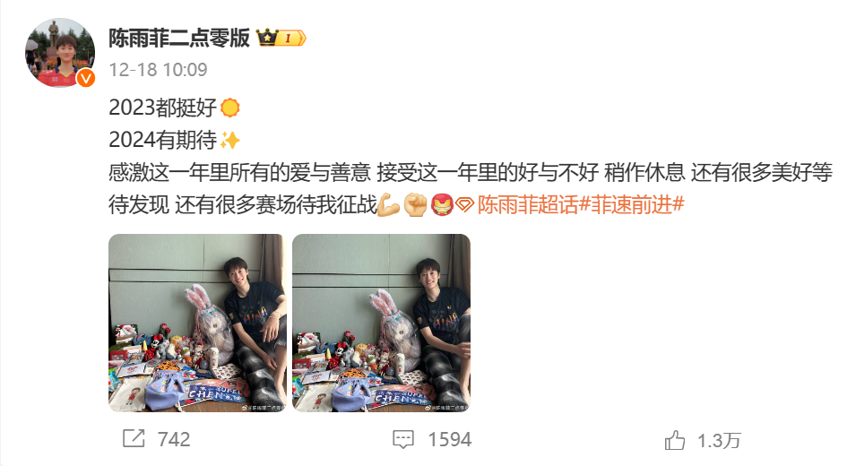 “今年于我,于我们而言都是转折和充满挑战的一年,在每一次未能如愿的不圆满中,我们去接受、克服、再重新埋下渴望胜利的一颗颗种子。”黄东萍这样总结“凤凰组合”的2023。陈雨菲则写道:“2023都挺好,2024有期待……稍作休息,还有很多美好等待发现,还有很多赛场待我征战。”石宇奇说:“明年再战。”