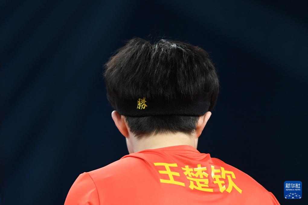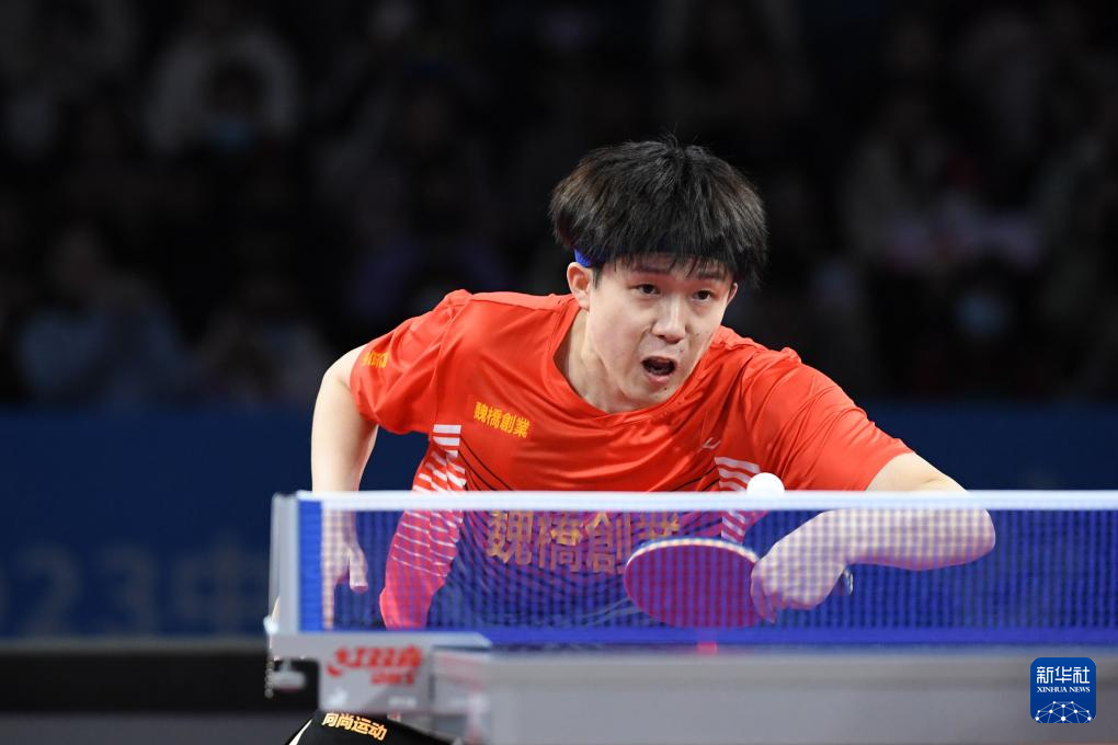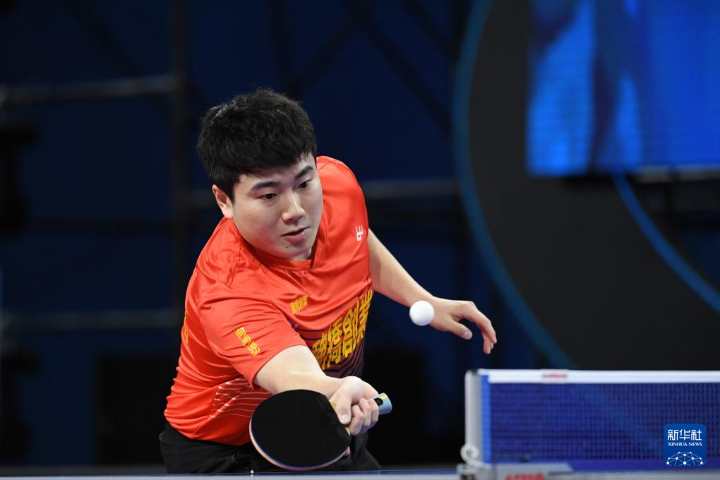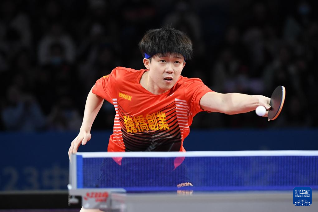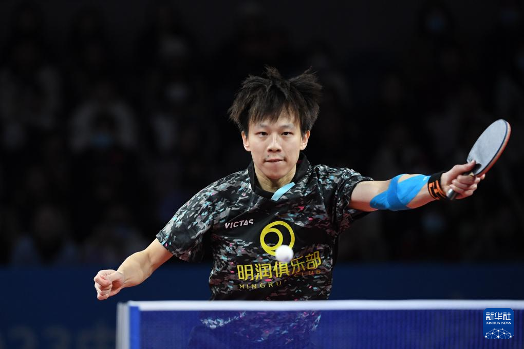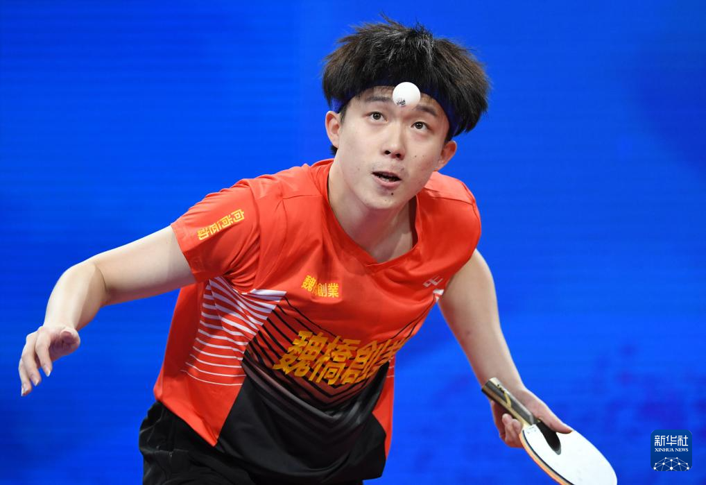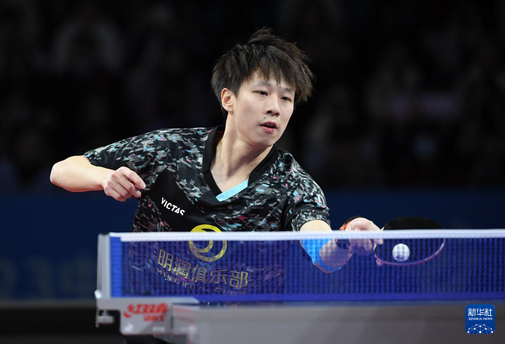 12月23日,山东魏桥队选手王楚钦在男单比赛中回球。他以3比0战胜汕头明润队选手林高远。