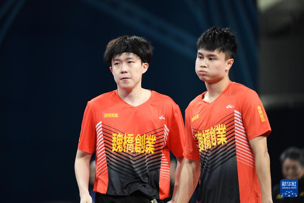 12月23日,山东魏桥队组合周启豪(右)/王楚钦在男双比赛后。他们以0比3不敌汕头明润队组合徐海东/林高远。