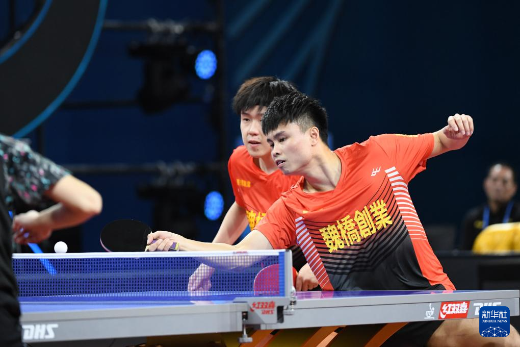 12月23日,汕头明润队组合徐海东/林高远(左)在男双比赛中。他们以3比0战胜山东魏桥队组合周启豪/王楚钦。