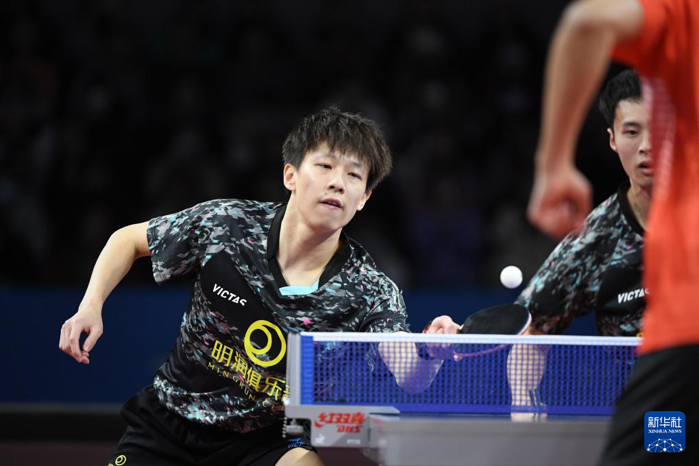 12月23日,山东魏桥队组合周启豪(前)/王楚钦在男双比赛中。他们以0比3不敌汕头明润队组合徐海东/林高远。
