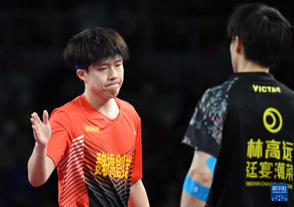 12月23日,山东魏桥队选手王楚钦在男双比赛中。他和周启豪以0比3不敌汕头明润队组合徐海东/林高远。
