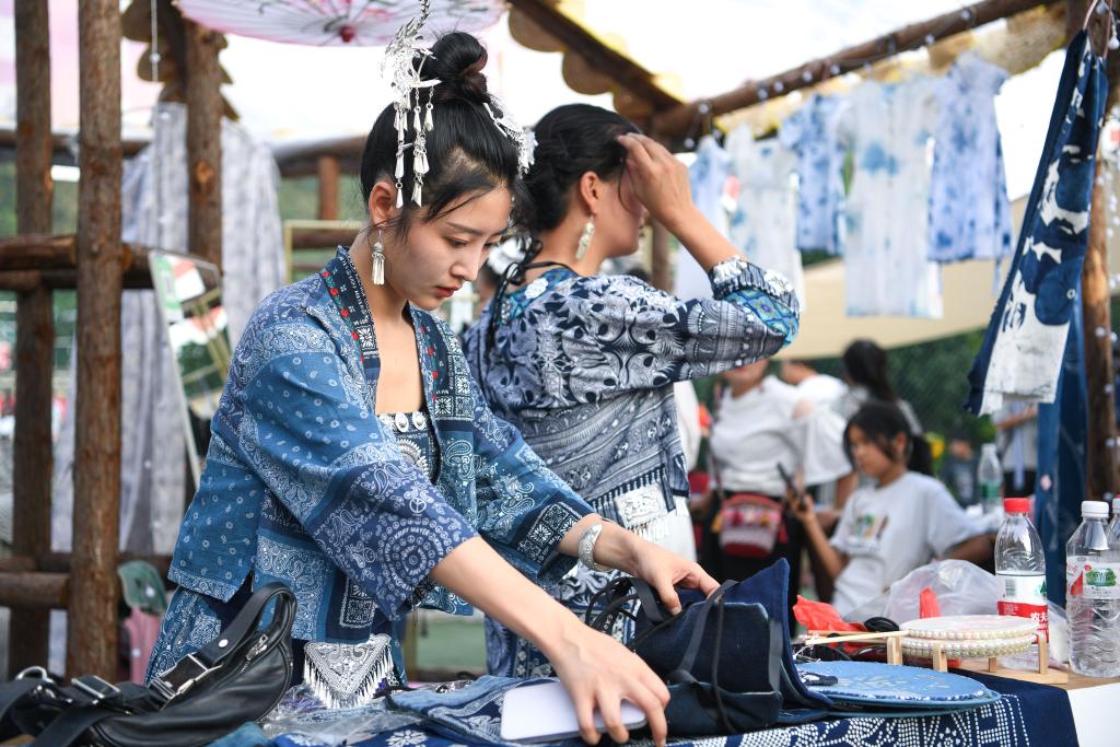 7月1日,少数民族姑娘在贵州“村超”足球赛场旁设置的文创摊位整理文创饰品。新华社记者 杨文斌 摄