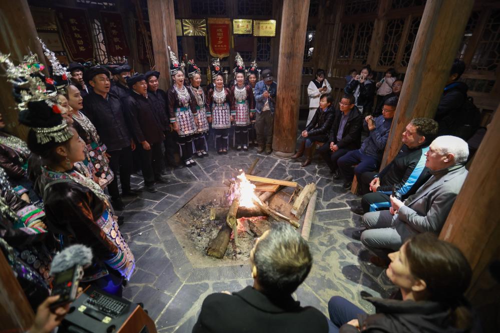 12月11日,榕江县少数民族同胞用歌舞欢迎“学转英超”培训团队。新华社记者 刘续 摄