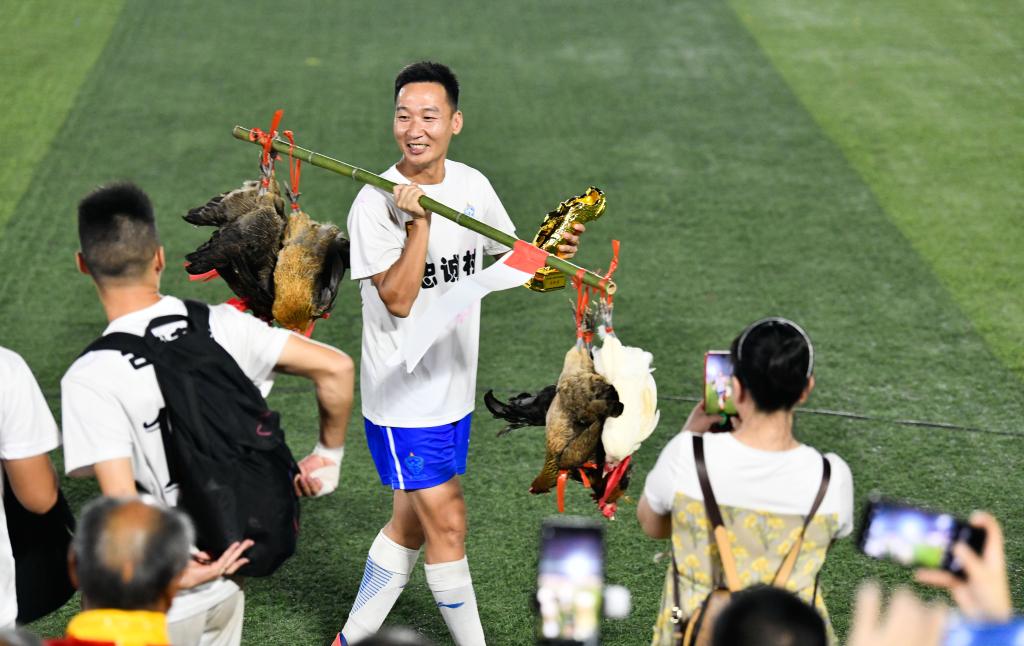 7月29日,忠诚村足球队球员董永恒展示“村超”最佳射手奖品——榕江小香鸡。新华社记者 杨文斌 摄