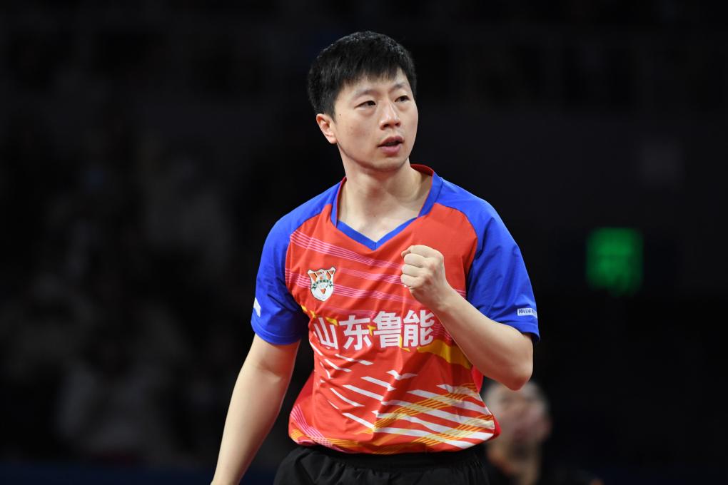 12月24日,山东鲁能队选手马龙在男单比赛中庆祝得分。新华社记者 梁旭 摄