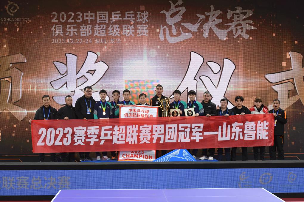 新华社深圳12月24日电(记者赵紫羽、王浩明、梁旭)2023赛季中国乒乓球俱乐部超级联赛总决赛24日在深圳决出冠军归属。马龙坐镇的山东鲁能队获得男团冠军,陈梦、孙颖莎领衔的深圳大学队获得女团冠军。