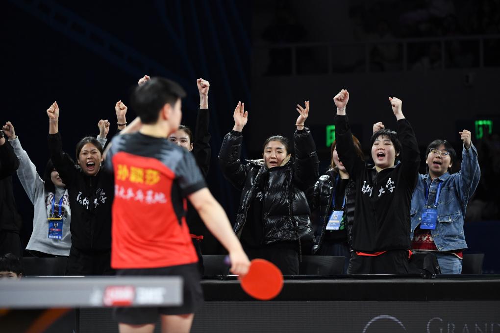 12月24日,深圳大学队成员在女单比赛中庆祝孙颖莎(前)得分。她以3比0战胜山东鲁能队选手范思琦。新华社记者 梁旭 摄