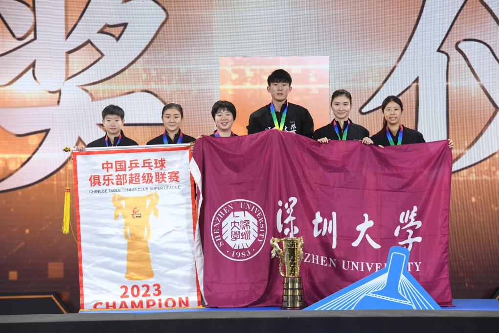 当日,在广东深圳举行的2023中国乒乓球俱乐部超级联赛总决赛女子团体决赛中,深圳大学队以总比分3比2战胜山东鲁能队,获得冠军。
