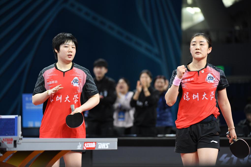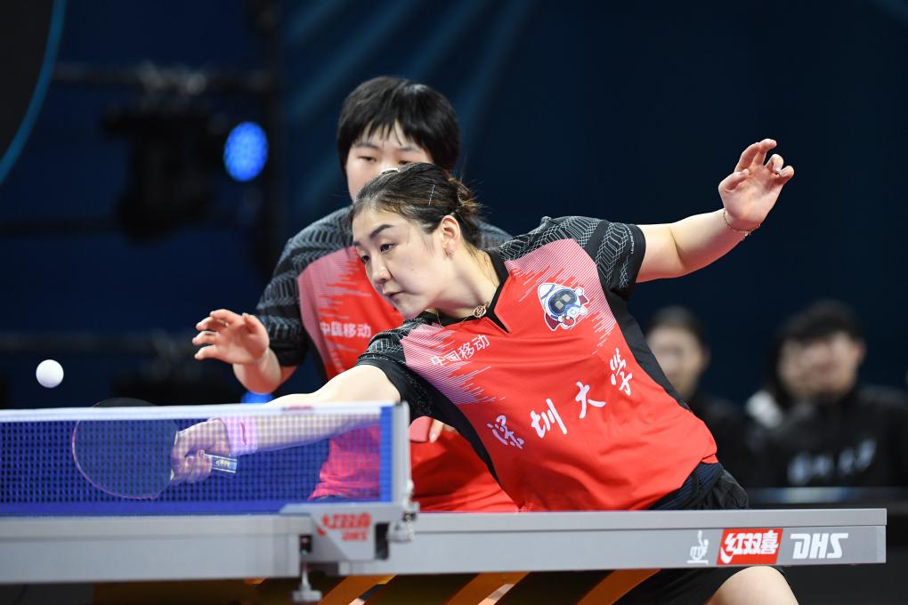 12月24日,深圳大学队组合蒯曼/陈梦(右)在女双比赛中。她们以3比2战胜山东鲁能队组合范思琦/钱天一。新华社记者 梁旭 摄