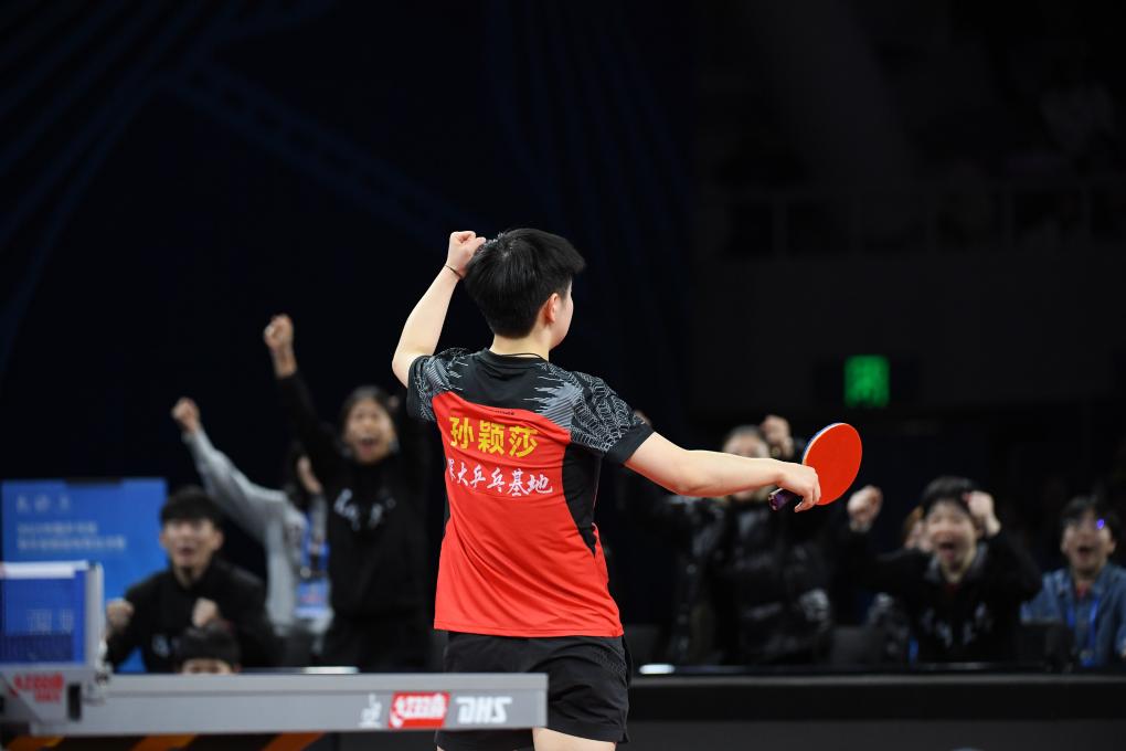 12月24日,深圳大学队选手孙颖莎在女单比赛中庆祝得分。她以2比3不敌山东鲁能队选手王曼昱。新华社记者 梁旭 摄