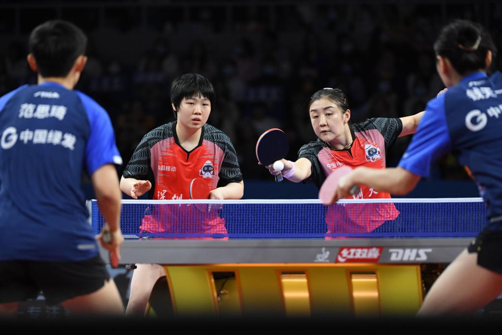 12月24日,深圳大学队组合蒯曼(左二)/陈梦(右二)在比赛中。她们以3比2战胜山东鲁能队组合范思琦/钱天一。新华社记者 梁旭 摄