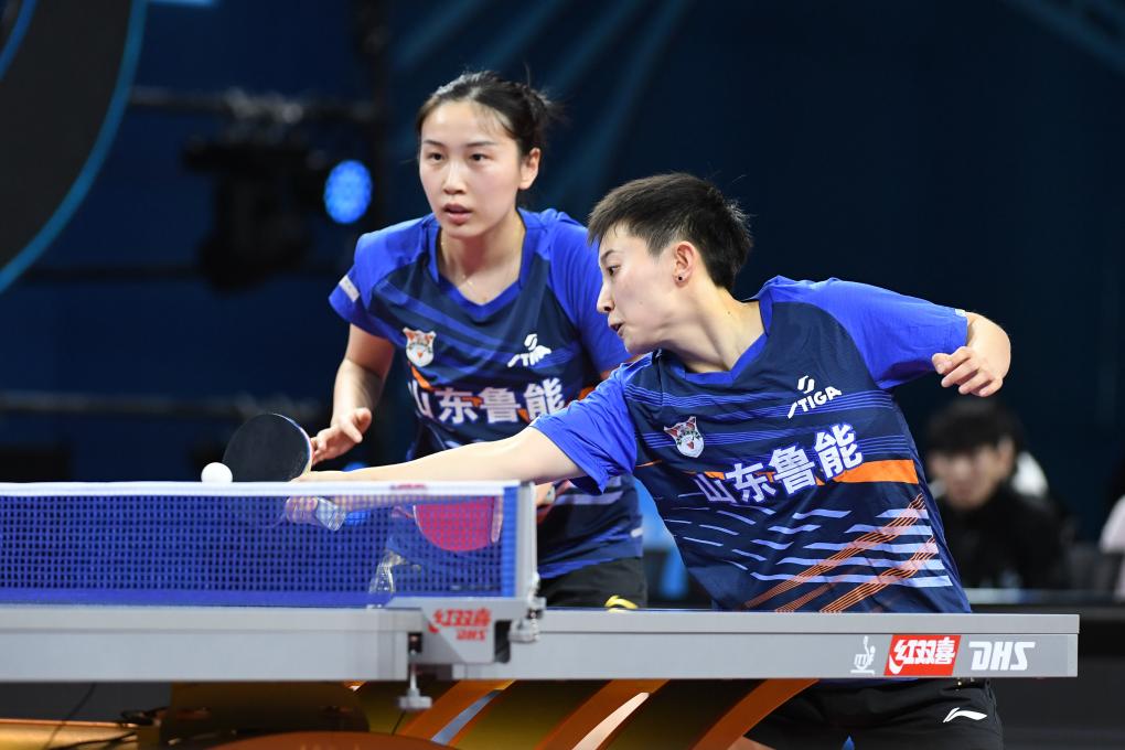 12月24日,山东鲁能队组合范思琦(右)/钱天一在女双比赛中。她们以2比3不敌深圳大学队组合蒯曼/陈梦。新华社记者 梁旭 摄