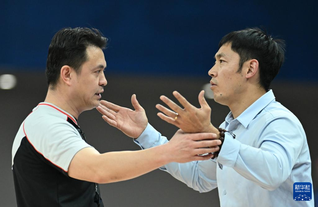 12月25日,天津先行者队主教练张庆鹏(右)与裁判交流。新华社记者 孙凡越 摄