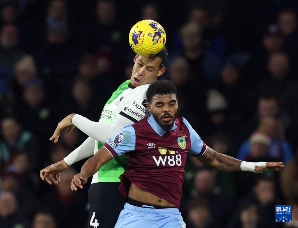 12月26日,利物浦队球员范戴克(左)在比赛中与伯恩利队球员福斯特争顶头球。新华社/路透