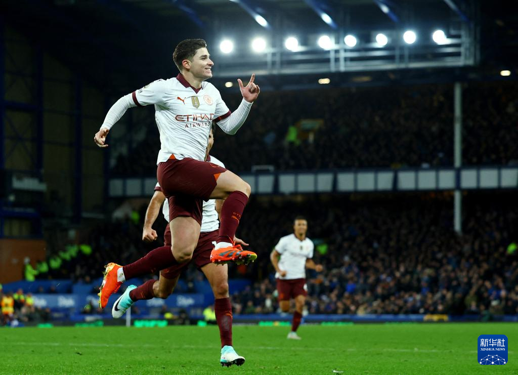 12月27日,曼城队球员阿尔瓦雷斯(前)在比赛中庆祝进球。新华社/路透
