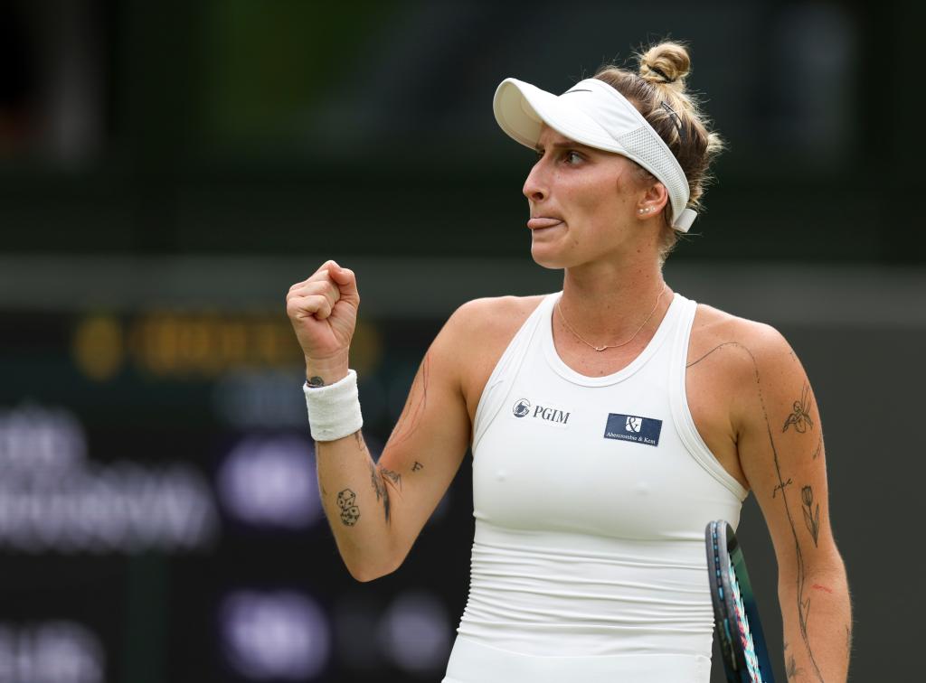 7月15日,万卓索娃在比赛中庆祝得分。当日,在英国伦敦举行的2023温布尔登网球公开赛女子单打决赛中,捷克选手万卓索娃以2:0战胜突尼斯选手贾贝乌尔,夺得冠军。新华社记者 韩岩 摄