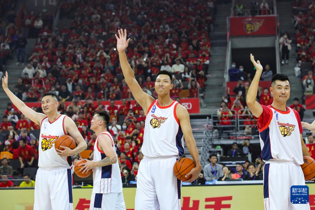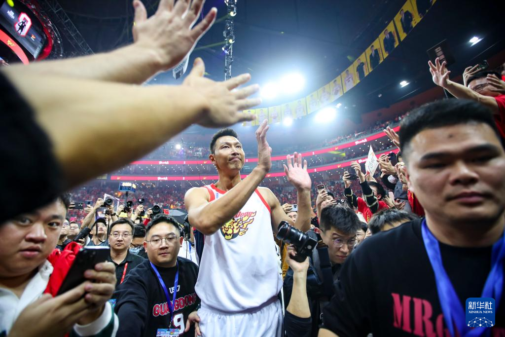 12月29日,易建联(中)在仪式后穿着9号球衣重回球场,与广东宏远队老队员一起向球迷挥手致意。新华社发(郑家雄摄)