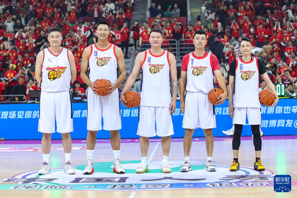 12月29日,广东宏远队老队员杜锋、易建联、朱芳雨、王仕鹏、陈江华(从左至右)在仪式后合影。新华社发(郑家雄摄)