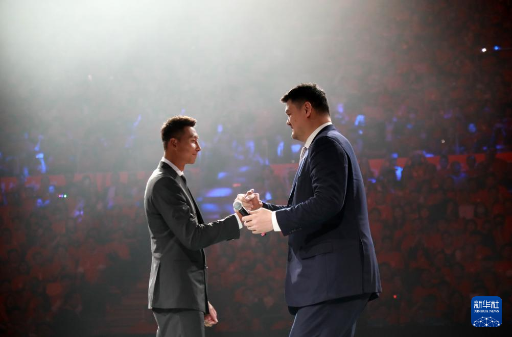12月29日,易建联与中国篮球协会主席姚明(右)在仪式上握手致意。新华社记者 黄国保 摄