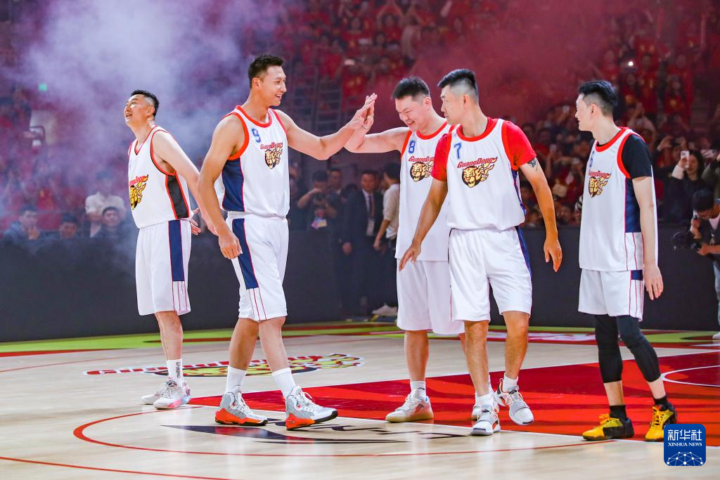 12月29日,易建联(左二)在仪式后穿着9号球衣重回球场,与广东宏远队老队员朱芳雨击掌致意。新华社发(郑家雄摄)