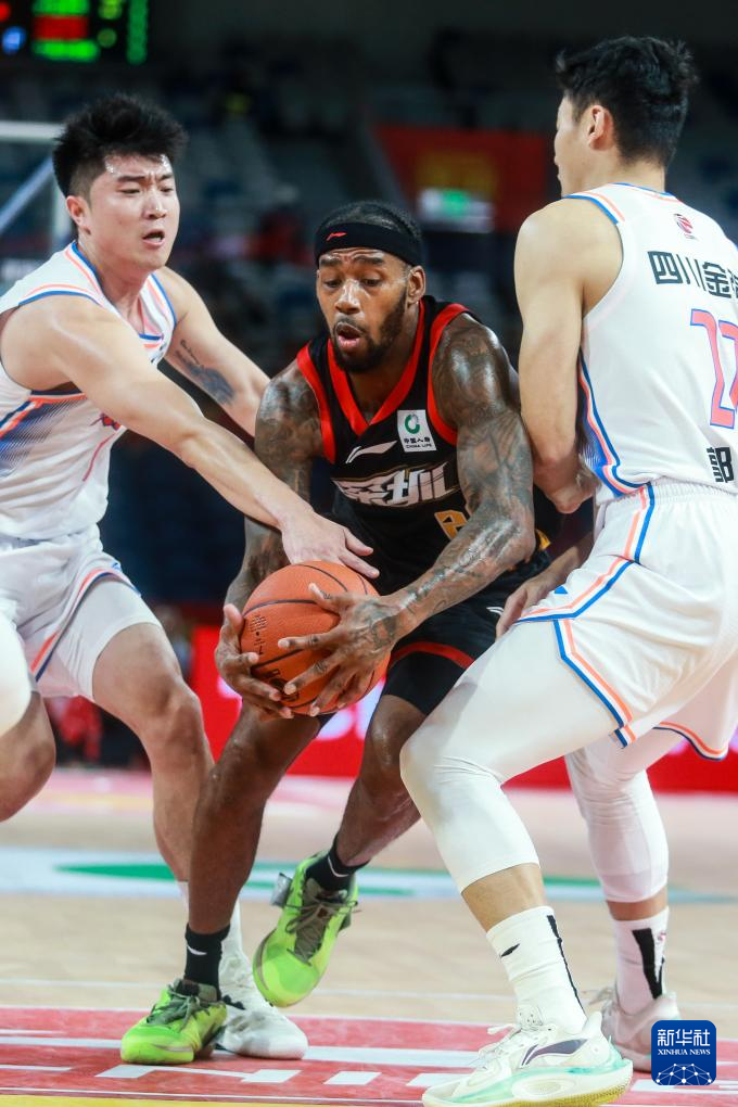 12月29日,深圳马可波罗队球员亚当斯(中)在比赛中进攻遭到四川金强队球员夹防。新华社发(彭志刚摄)