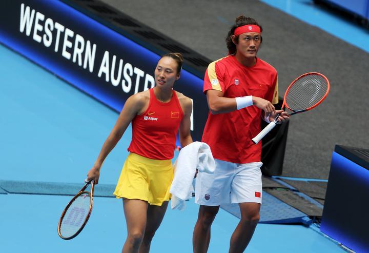 12月30日,中国组合张之臻/郑钦文(左)在混双比赛中休息。新华社发(周丹摄)