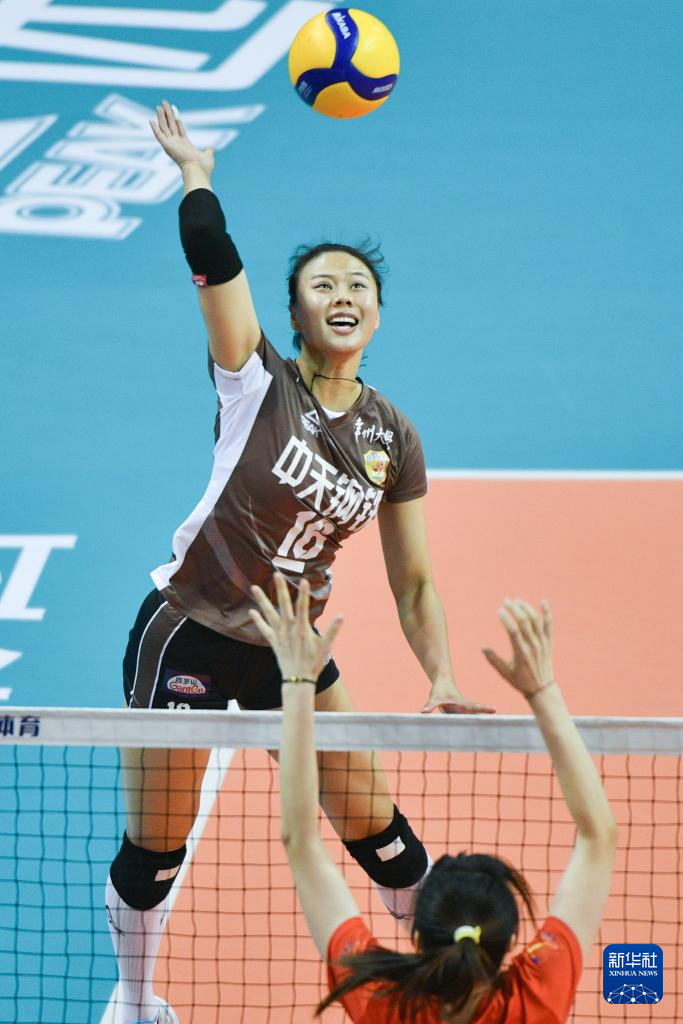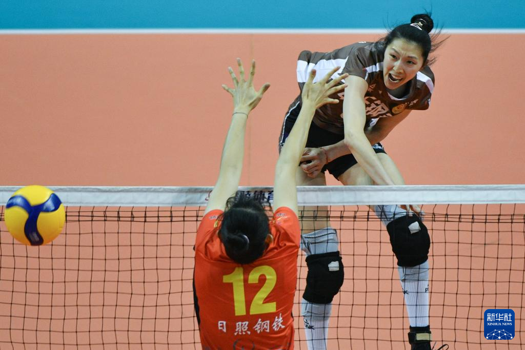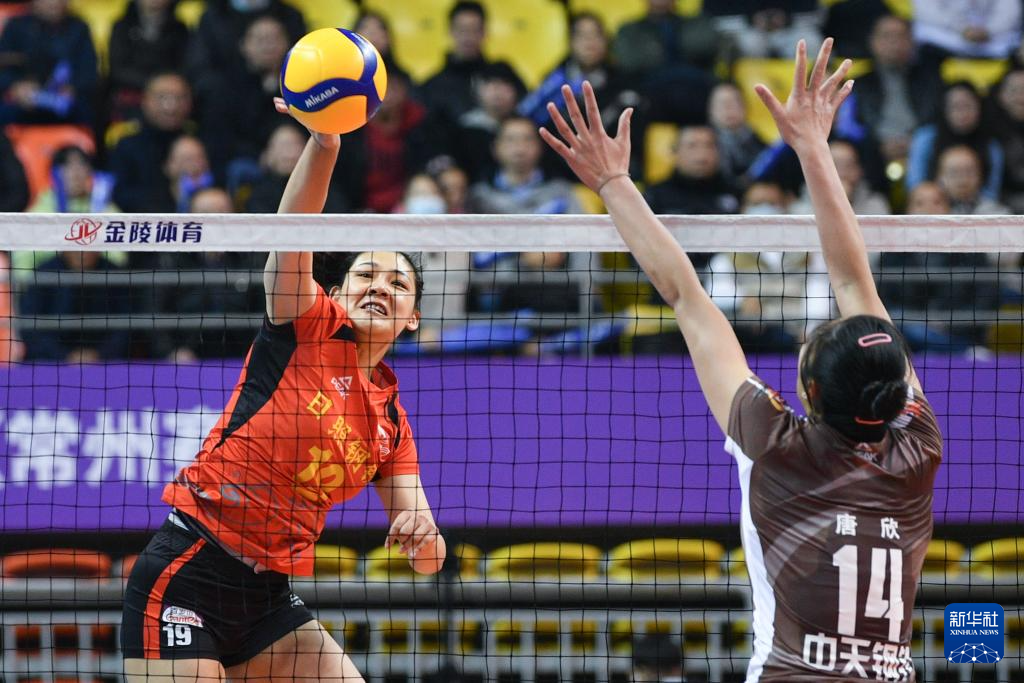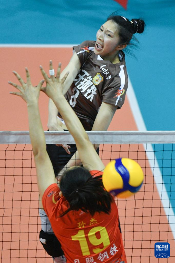 12月30日,江苏中天钢铁队球员万梓玥(右)在比赛中扣球。