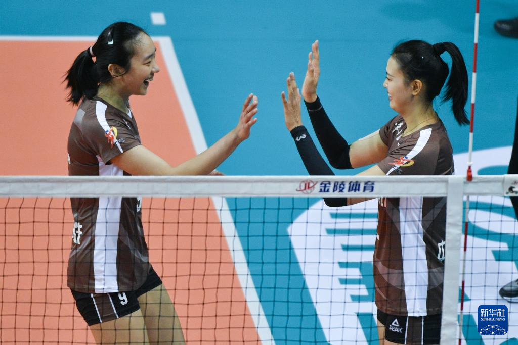 12月30日,江苏中天钢铁队球员吴梦洁(左)在比赛中庆祝得分。