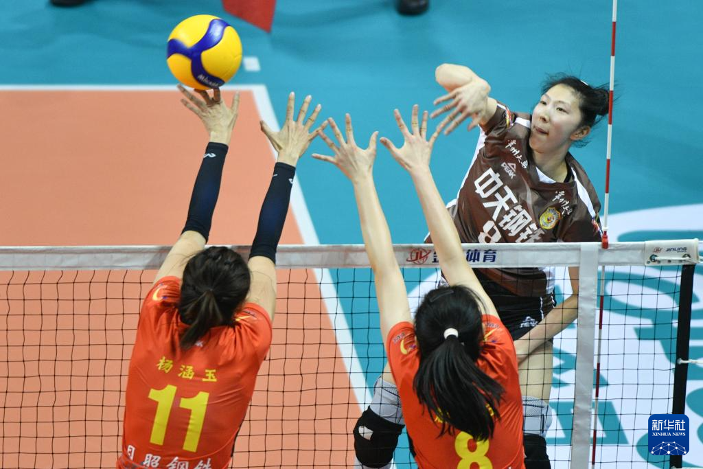 12月30日,山东日照钢铁队球员杨涵玉(右一)和队友孙杰(左二)在比赛中拦网。