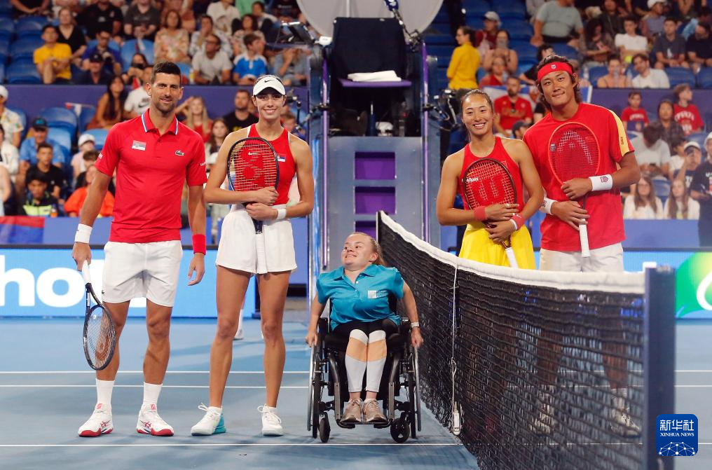 2023年12月31日,中国组合郑钦文(右二)/张之臻(右一)与塞尔维亚组合焦科维奇(左一)/丹尼洛维奇(左二)在混双比赛前合影。最终,郑钦文/张之臻1比2不敌焦科维奇/丹尼洛维奇。