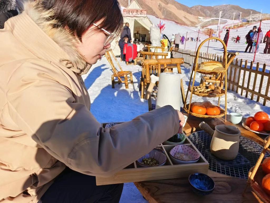 走出雪具大厅,几张围炉煮茶的小桌子格外吸引眼球。“今年围炉煮茶特别火,我们也辟出一块区域,支了几张桌子,可以给那些陪家人来滑雪场的‘观众’提供一种更新颖的等待家人的方式。”张小程说。