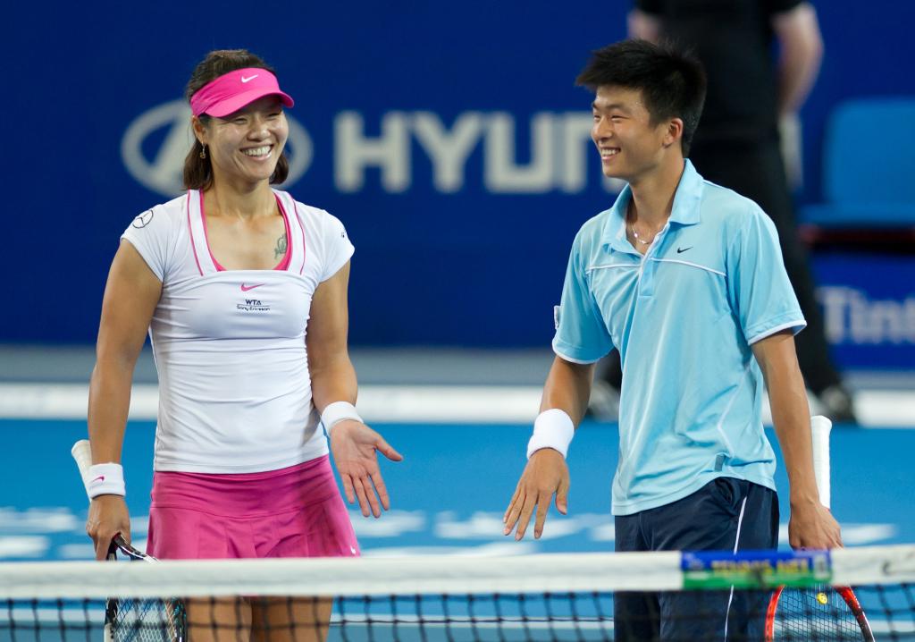 2012年1月3日,李娜(左)/吴迪在2012年霍普曼杯网球赛第四日比赛中。新华社发(白雪摄)