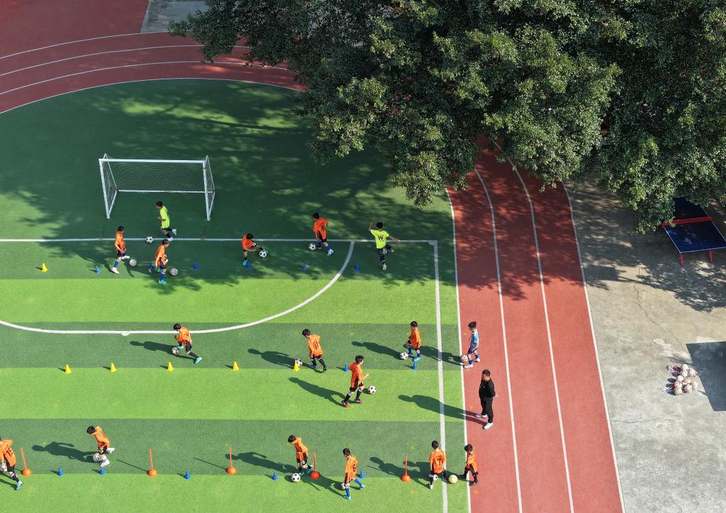 12月26日,小球员在水尾水族乡中心校内训练(无人机照片)。新华社记者 刘续 摄