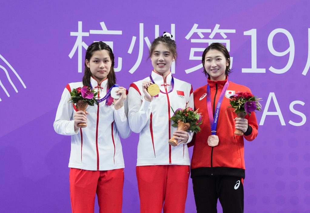 2023年9月29日,杭州亚运会游泳项目女子50米蝶泳冠军中国选手张雨霏(中)、亚军中国选手余依婷(左)和季军日本选手池江璃花子在颁奖仪式上。