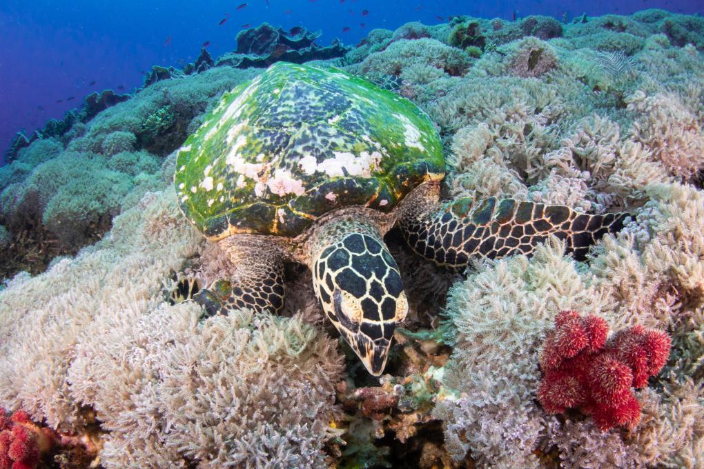 2018年10月27日,在印度尼西亚科莫多国家公园海域,一只海龟在进食。