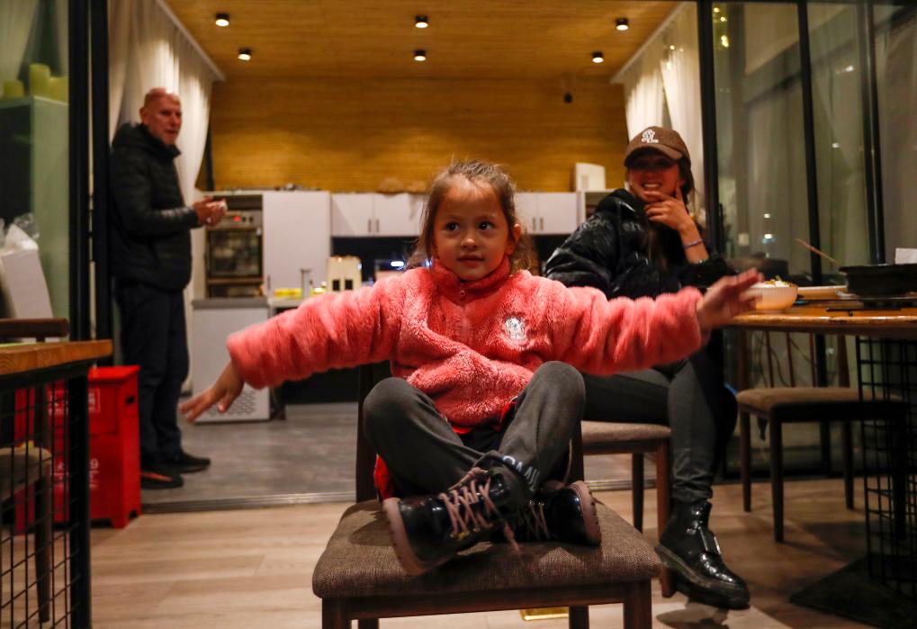 2023年3月23日,阿明和妻子黄琼观看女儿阿琳娜(中)为民宿客人表演节目。