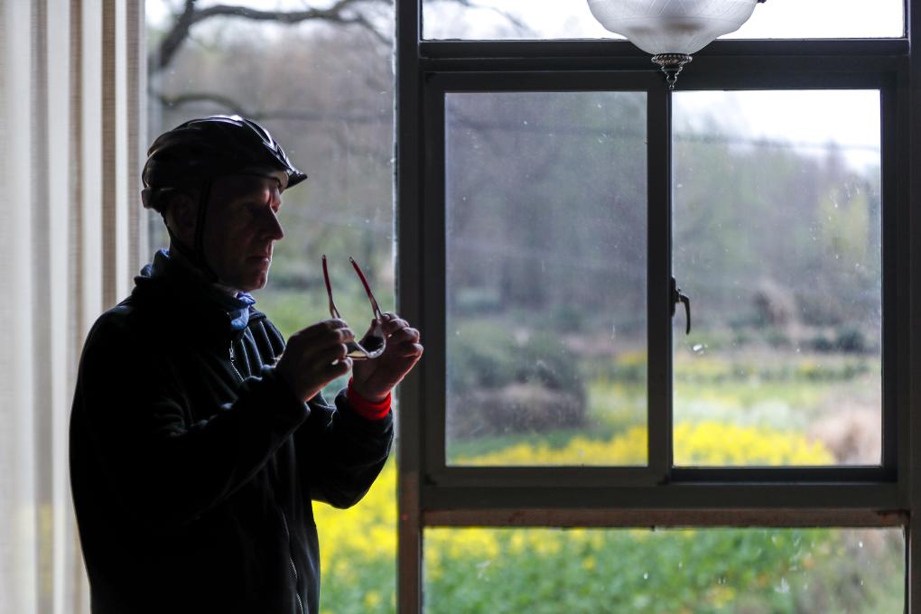 2023年3月23日,阿明在出门锻炼前佩戴骑行眼镜。新华社发(施亚磊摄)