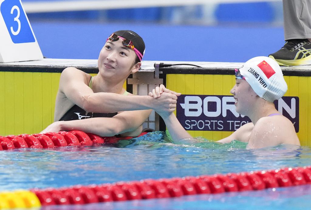 2023年9月29日,张雨霏(右)与池江璃花子在决赛后握手致意。