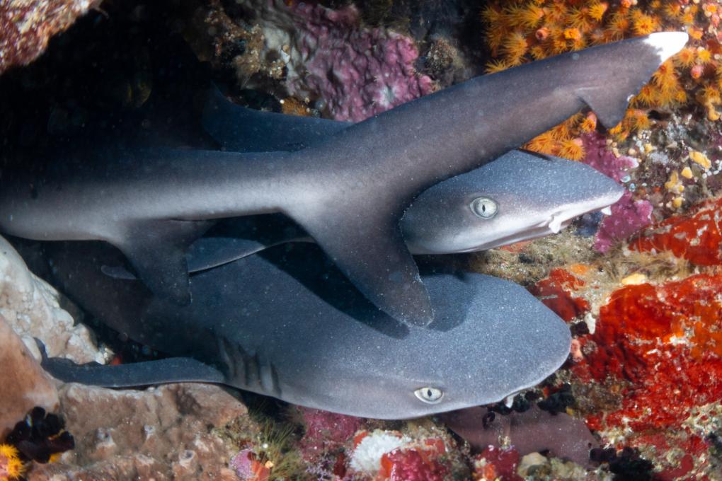 2018年10月26日,在印度尼西亚科莫多国家公园海域,3条小鲨鱼躲在一个洞穴中。