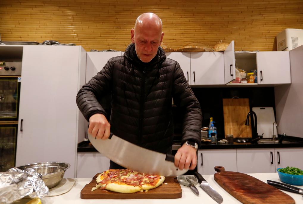 2023年3月23日,阿明在民宿的厨房内为客人切披萨。