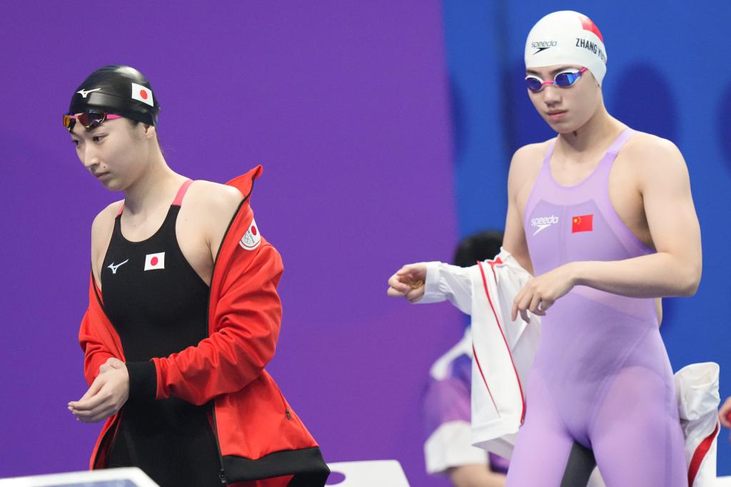2023年9月28日,张雨霏(右)和池江璃花子在女子50米自由泳预赛前。