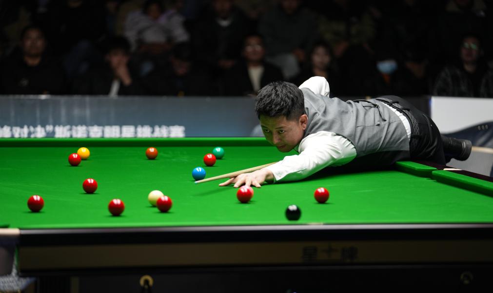 2023年12月31日,2023拉萨“巅峰对决”斯诺克明星挑战赛,伍金多吉在准备击球。新华社记者 晋美多吉 摄