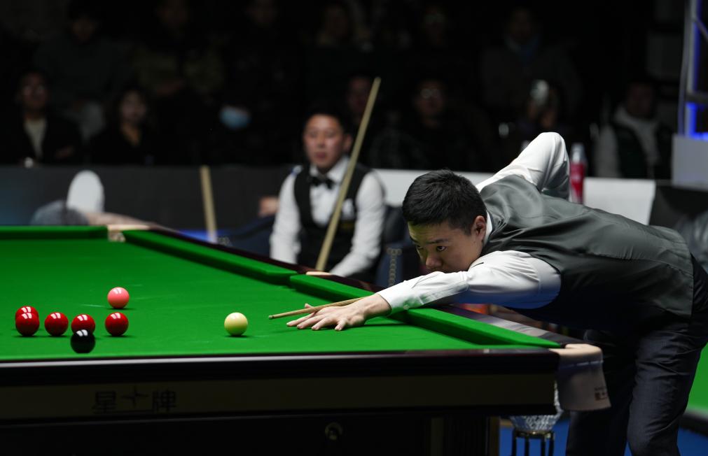 2023年12月31日,2023拉萨“巅峰对决”斯诺克明星挑战赛,丁俊晖在击球。新华社记者 晋美多吉 摄