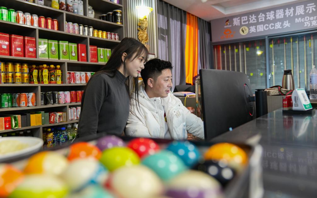 2023年12月29日,伍金多吉在自己的台球俱乐部查看当天的营业记录。新华社记者 晋美多吉 摄