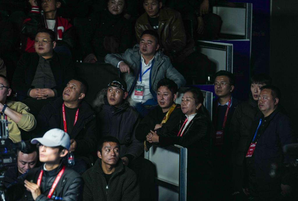 拉萨的斯诺克明星挑战赛上,伍金多吉(右五)一脸崇拜地看丁俊晖和奥沙利文的比赛。新华社记者 晋美多吉 摄