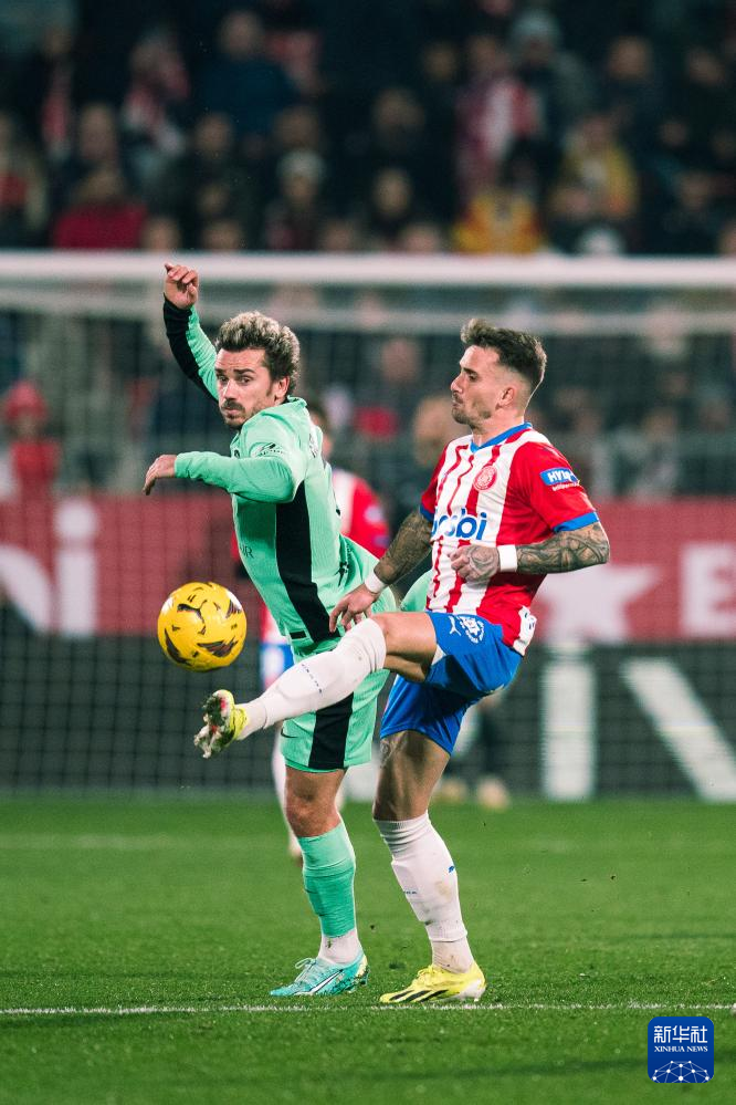 1月3日,赫罗纳队球员亚历克斯·加西亚(右)与马德里竞技队球员格列兹曼在比赛中拼抢。新华社发(胡安·戈萨摄)