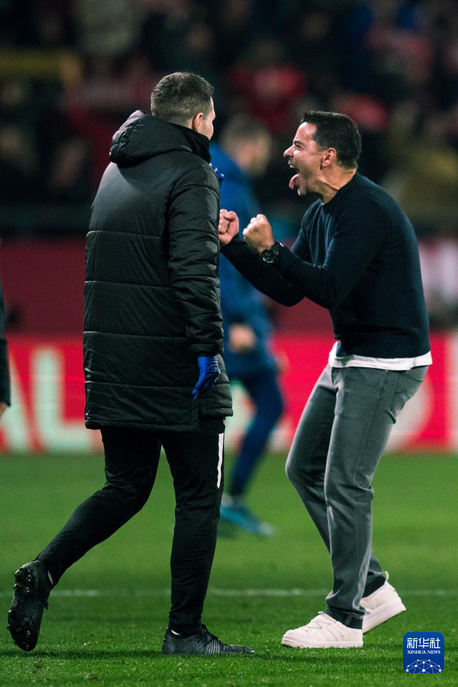 1月3日,赫罗纳队主教练米歇尔(右)在比赛后庆祝胜利。新华社发(胡安·戈萨摄)