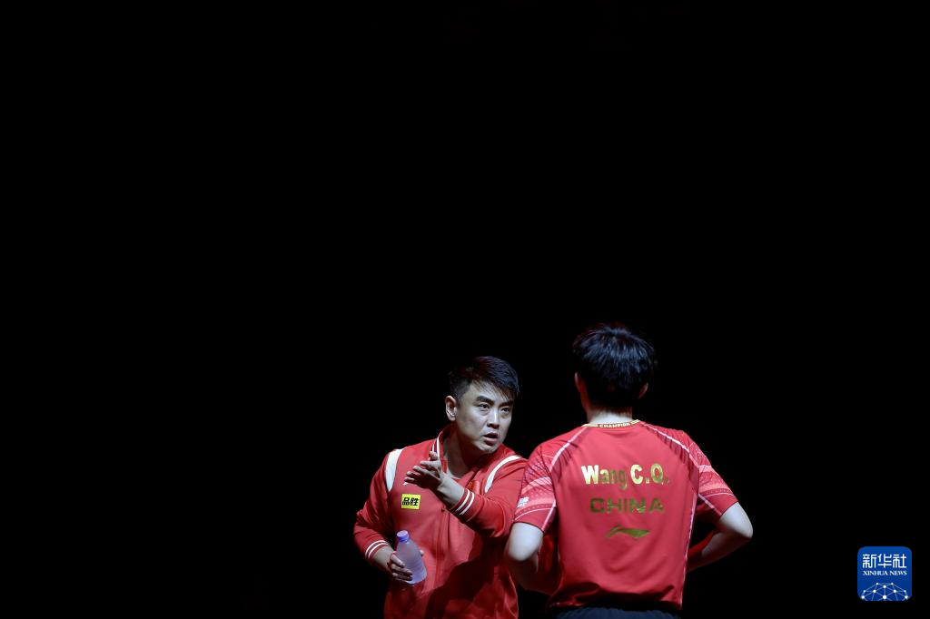 1月4日,王楚钦在比赛间隙接受教练王皓(左)的指导。新华社记者 王东震 摄