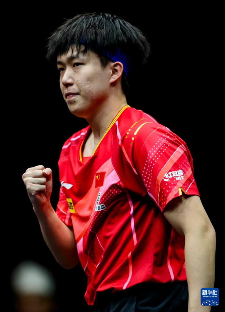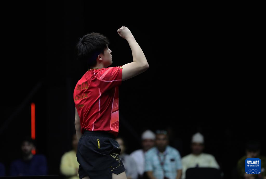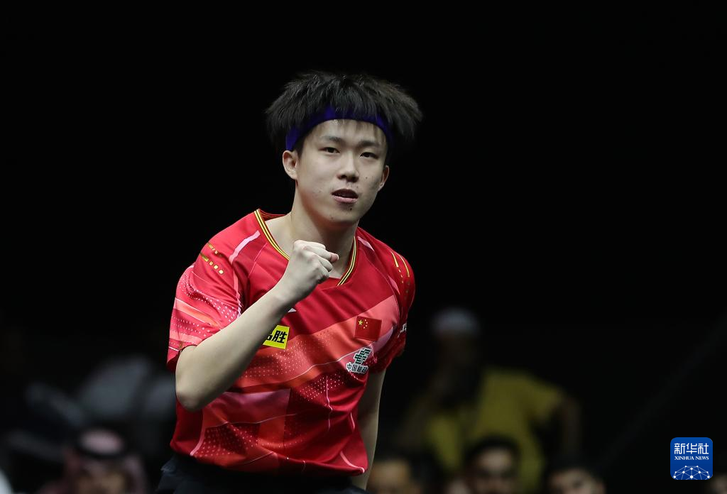 1月4日,王楚钦在比赛中庆祝得分。新华社发(尼库摄)